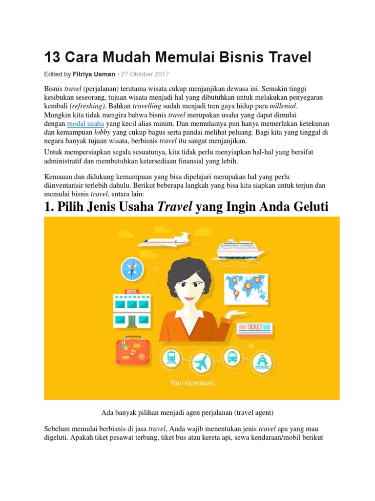 Memulai Bisnis Travel. Disini, modal bukan suatu hal utama yang harus dijadikan sebagai titik perhatian. Dengan kata lain, Anda bisa mulai dengan menjadi sebuah agen perjalanan dengan sistem.