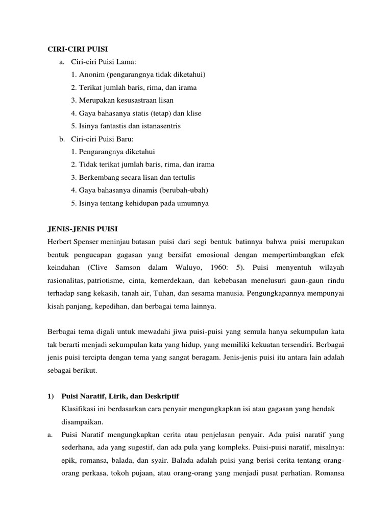 Mengenal Jenis-Jenis Puisi Modern (Martin Rodgers) Pengertian puisi kritik sosial adalah puisi-puisi kritikan yang membahas atau yang berisi tentang kecaman atau tanggapan serta perbandingan akan hal-hal tertentu didalam bermasyarakat menurut pengamatan sang penulis puisi. Puisi deskriptif itu sendiri adalah sebuah puisi yang menggambarkan objek tertentu - apakah itu orang, tempat, atau atmosfer-secara mendalam. Setiap hari, ayahku membersihkan lemari itu dengan kain basah.