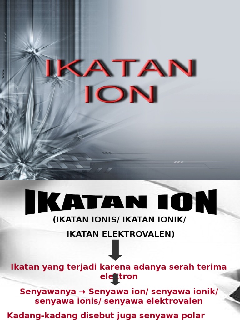 Senyawa ion adalah senyawa yang terbentuk dari unsur logam (sebagai kation) dengan non logam (sebagai anion) menggunakan ikatan ion (serah terima elektron).